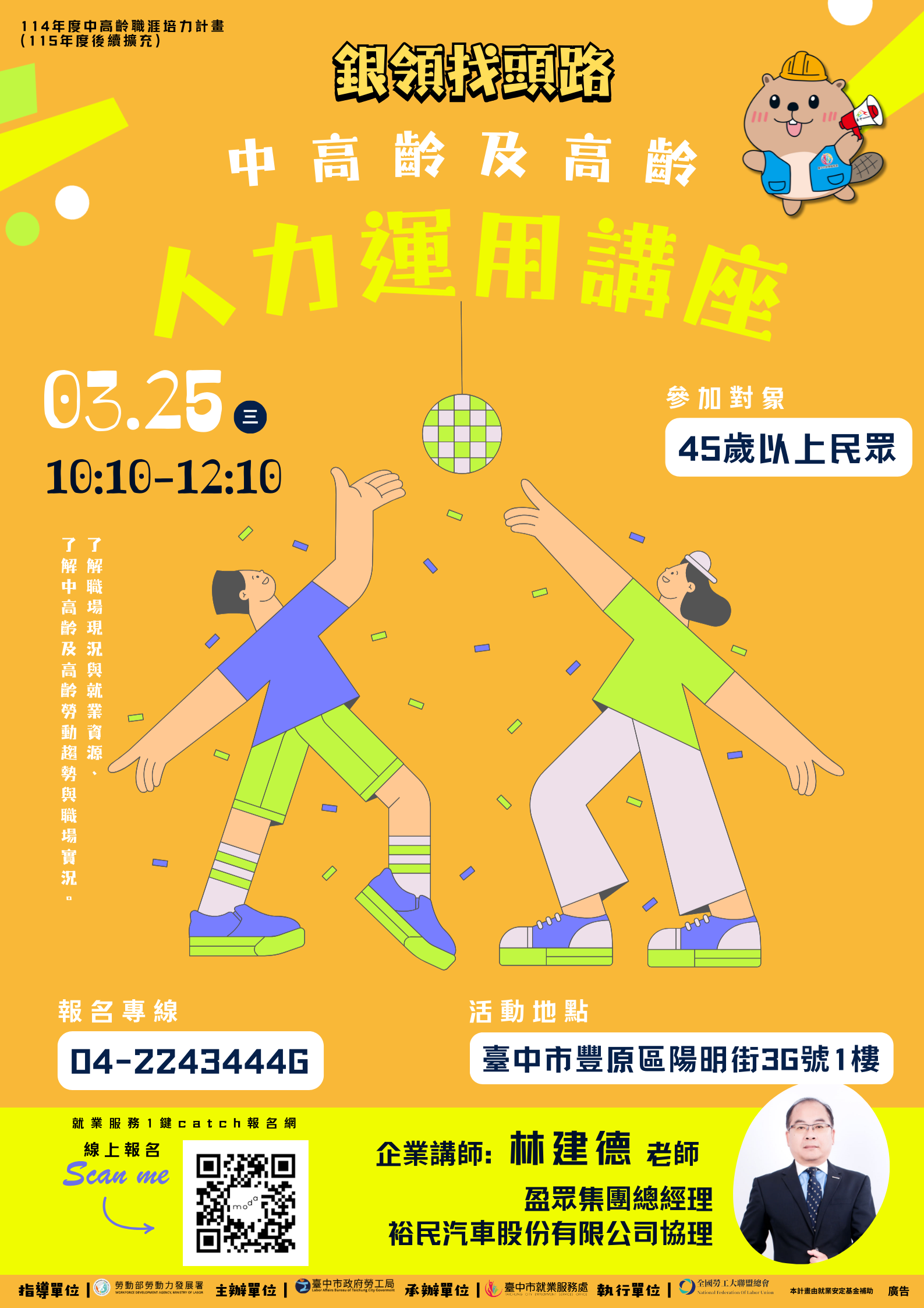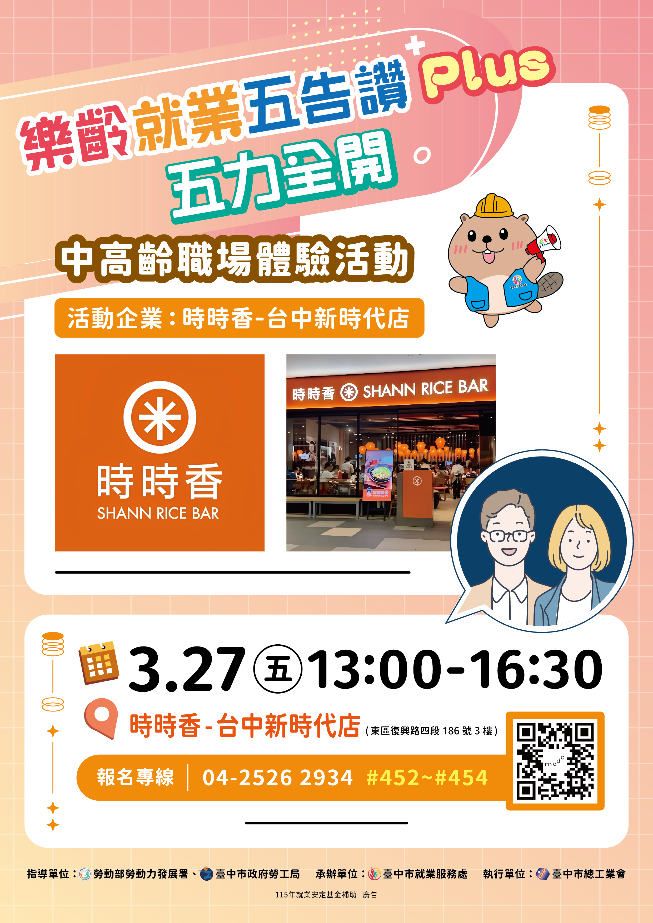 2/26(四)臺中市政府2026「富市台中就業成功」樂齡就業 月月有徵才