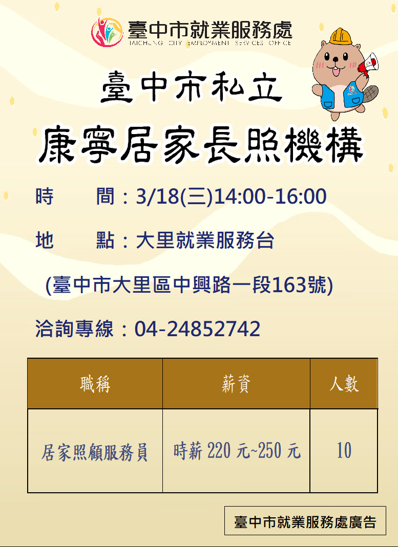 〔單一徵才〕臺中市私立康寧居家長照機構