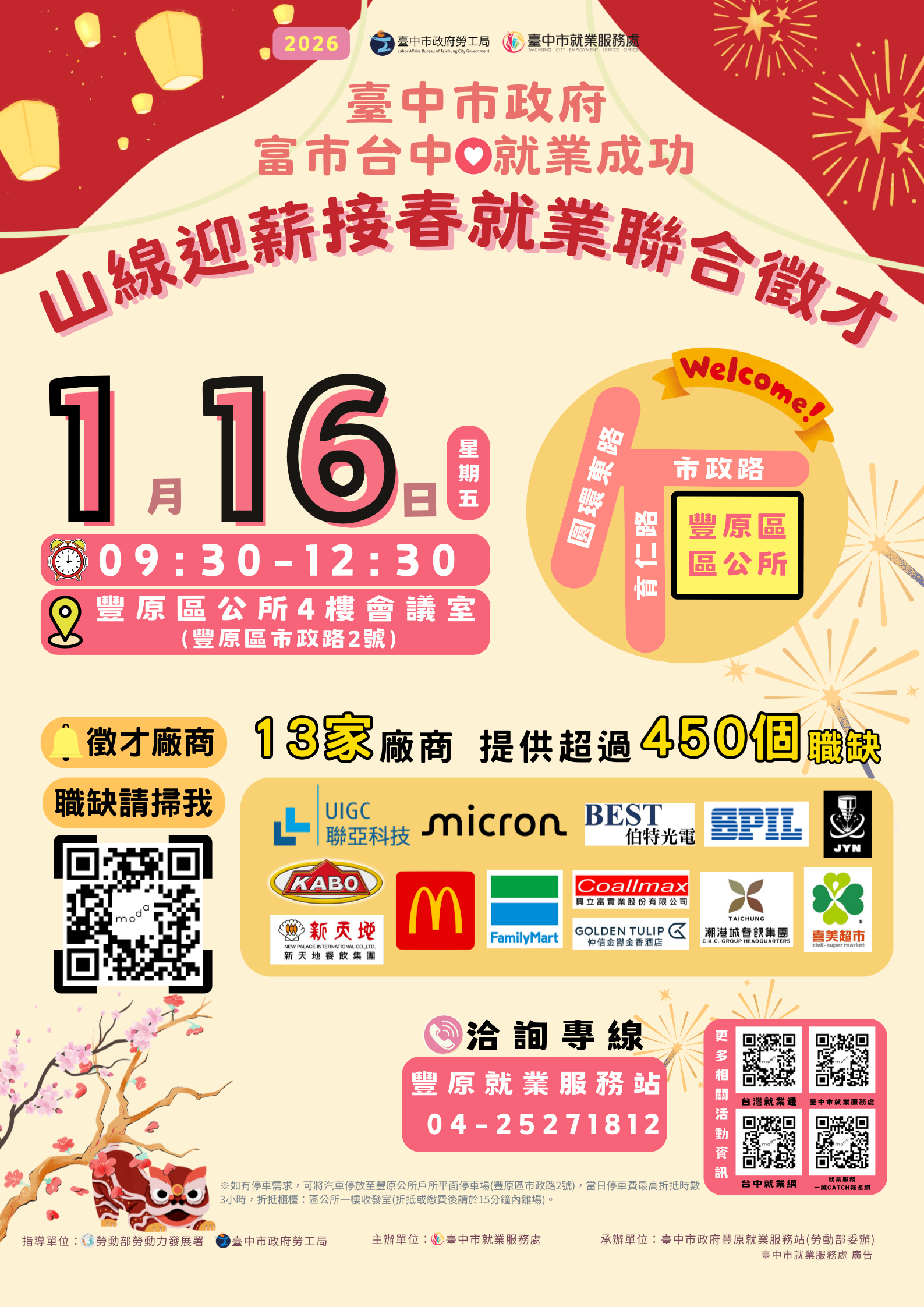 01/16(五)臺中市政府2026「富市台中 就業成功」山線迎薪接春就業聯合徵才