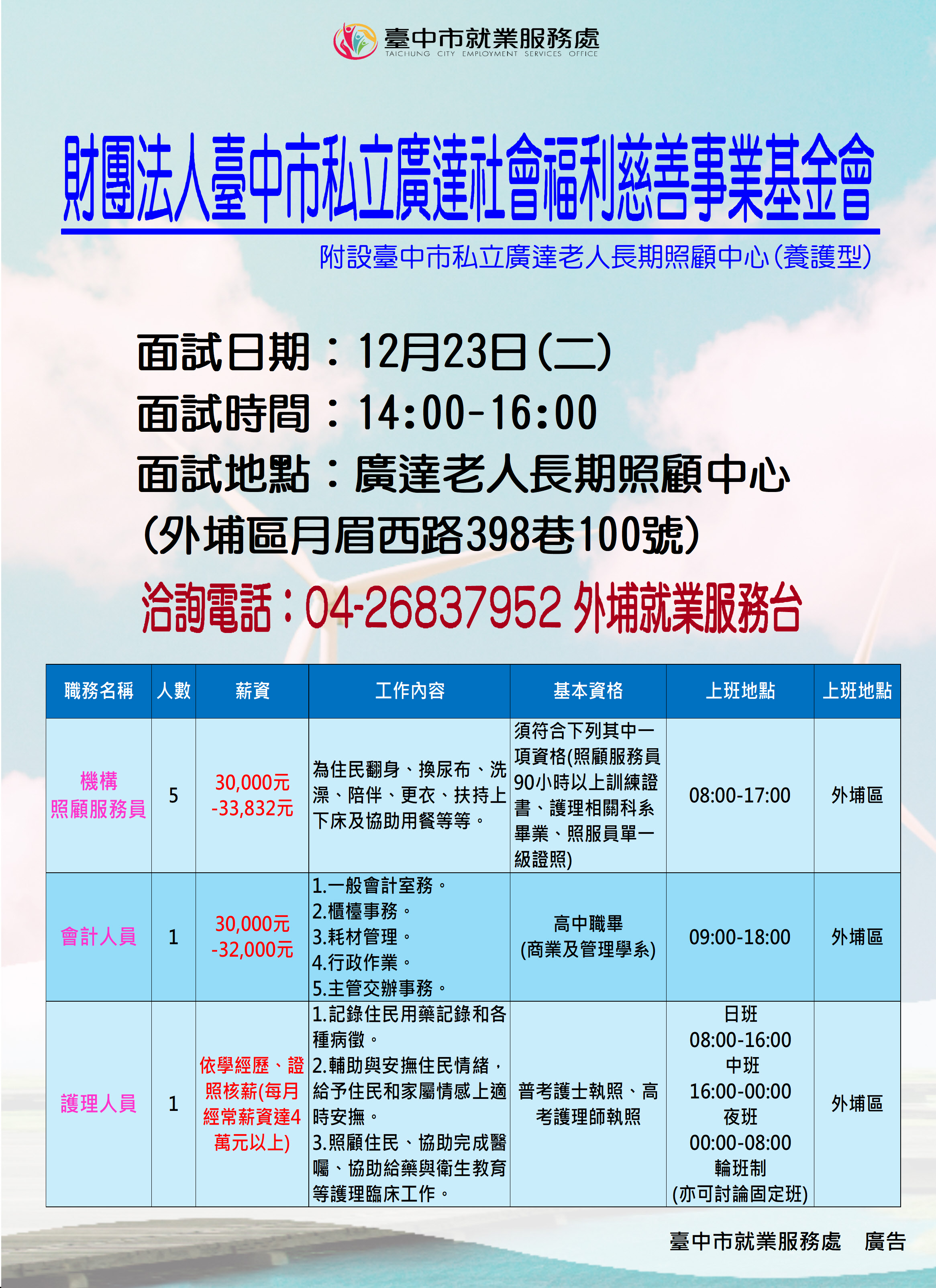 【單一徵才】財團法人臺中市私立廣達社會福利慈善事業基金會附設臺中市私立廣達老人長期照顧中心(養護型)