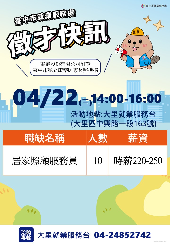 〔單一徵才〕秉定股份有限公司附設臺中市私立康寧居家長照機構