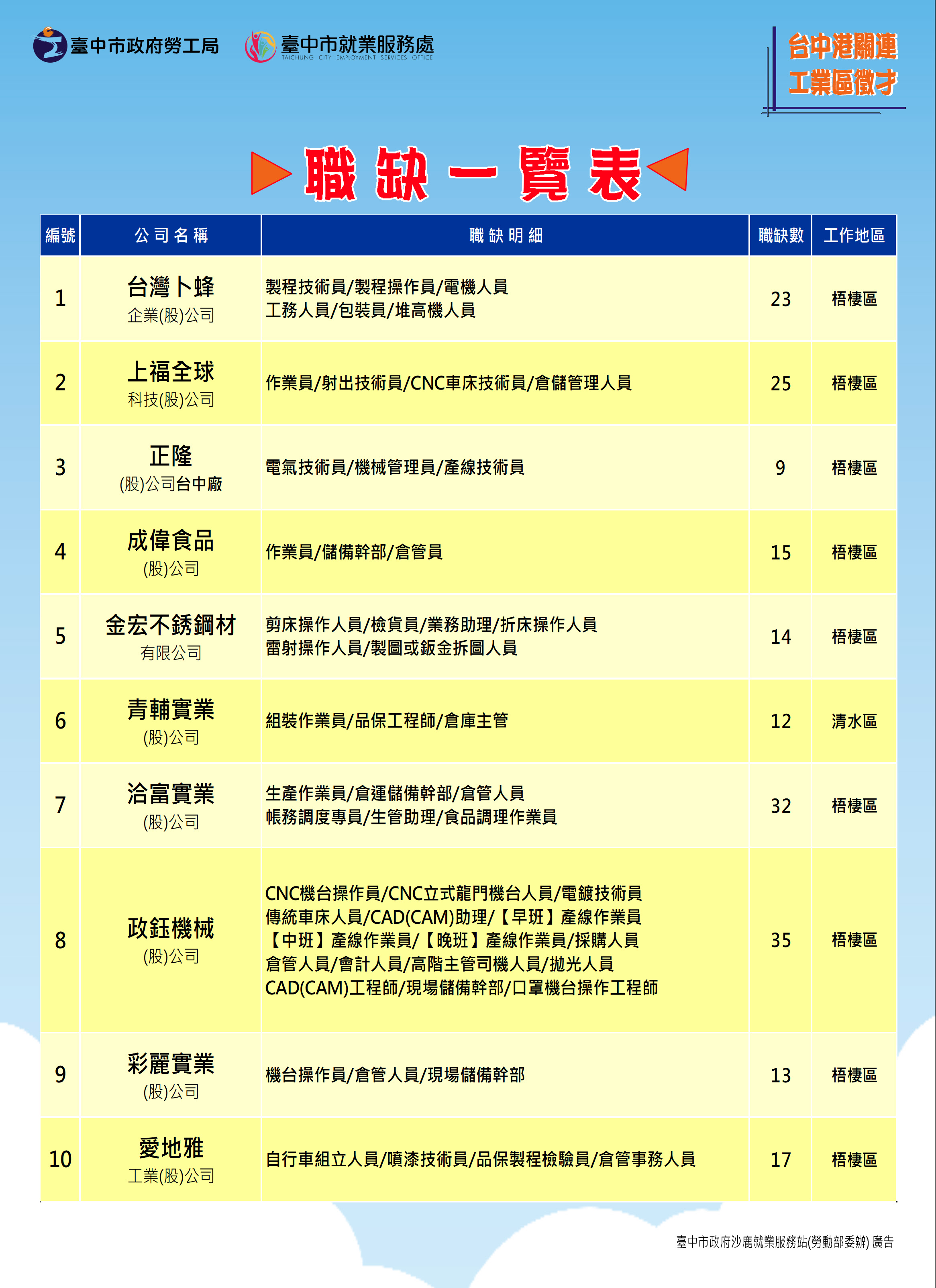 本場邀請台灣卜蜂、上福全球、正隆、成偉食品、金宏不銹鋼、青輔實業、洽富實業、政鈺機械、彩麗實業、愛地雅等共10家廠商設攤,提供工程師、儲備幹部、生管助理、電機人員、技術員、作業員、撿貨員、組立人員、調度專員、事務人員、採購及會計等計195個工作機會,歡迎民眾踴躍前往參加!