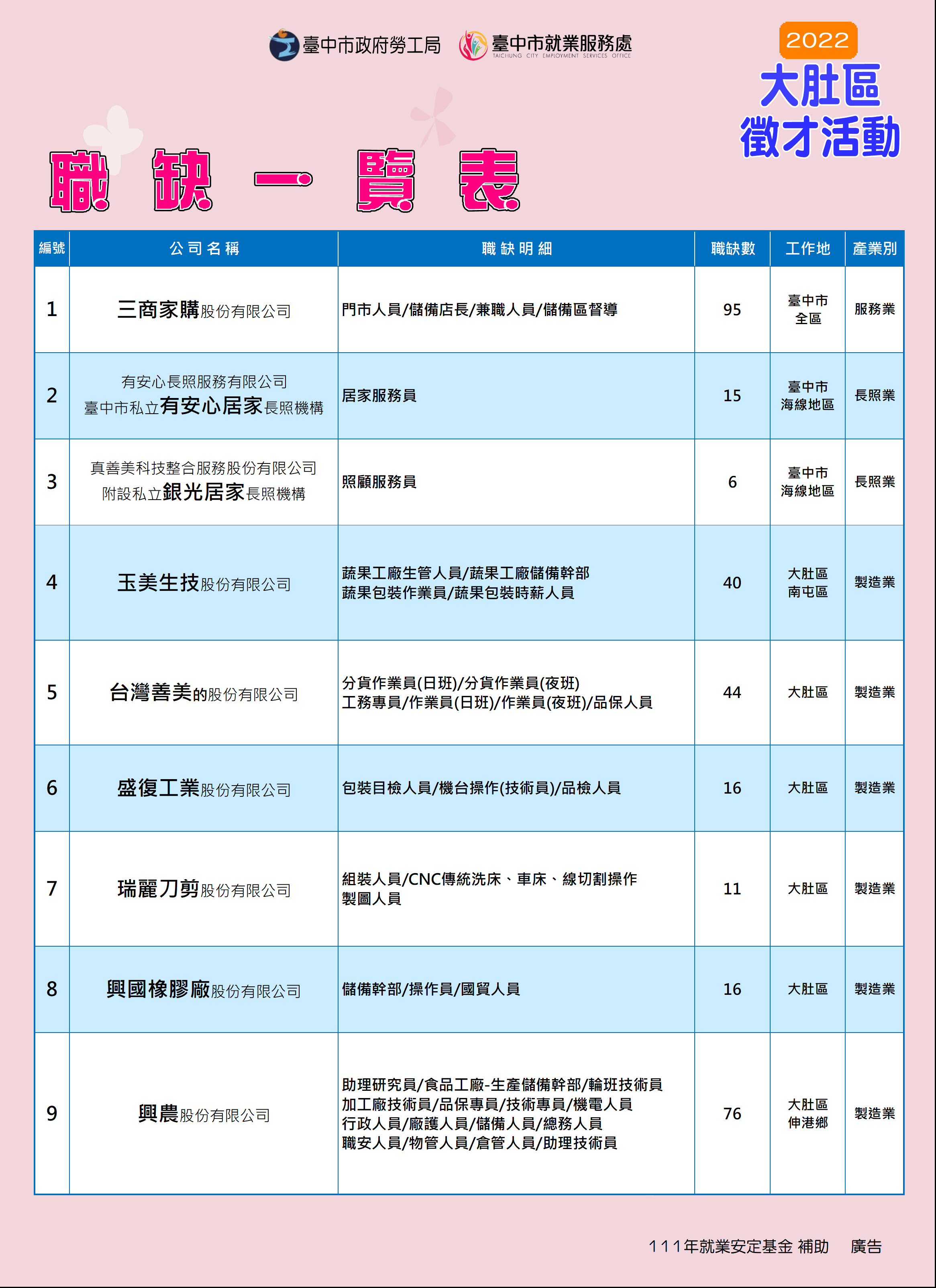 本場邀請三商家購(美聯社)、有安心居服、銀光居服、玉美生技、台灣善美的、盛復工業、瑞麗刀剪、興國橡膠、興農等計9家廠商,提供門市人員、店長、居服員、生管人員、儲備幹部、廠護人員、包裝員、組裝員、國貿人員、作業員及助理研究員等計319個職缺,歡迎民眾踴躍前往參加!