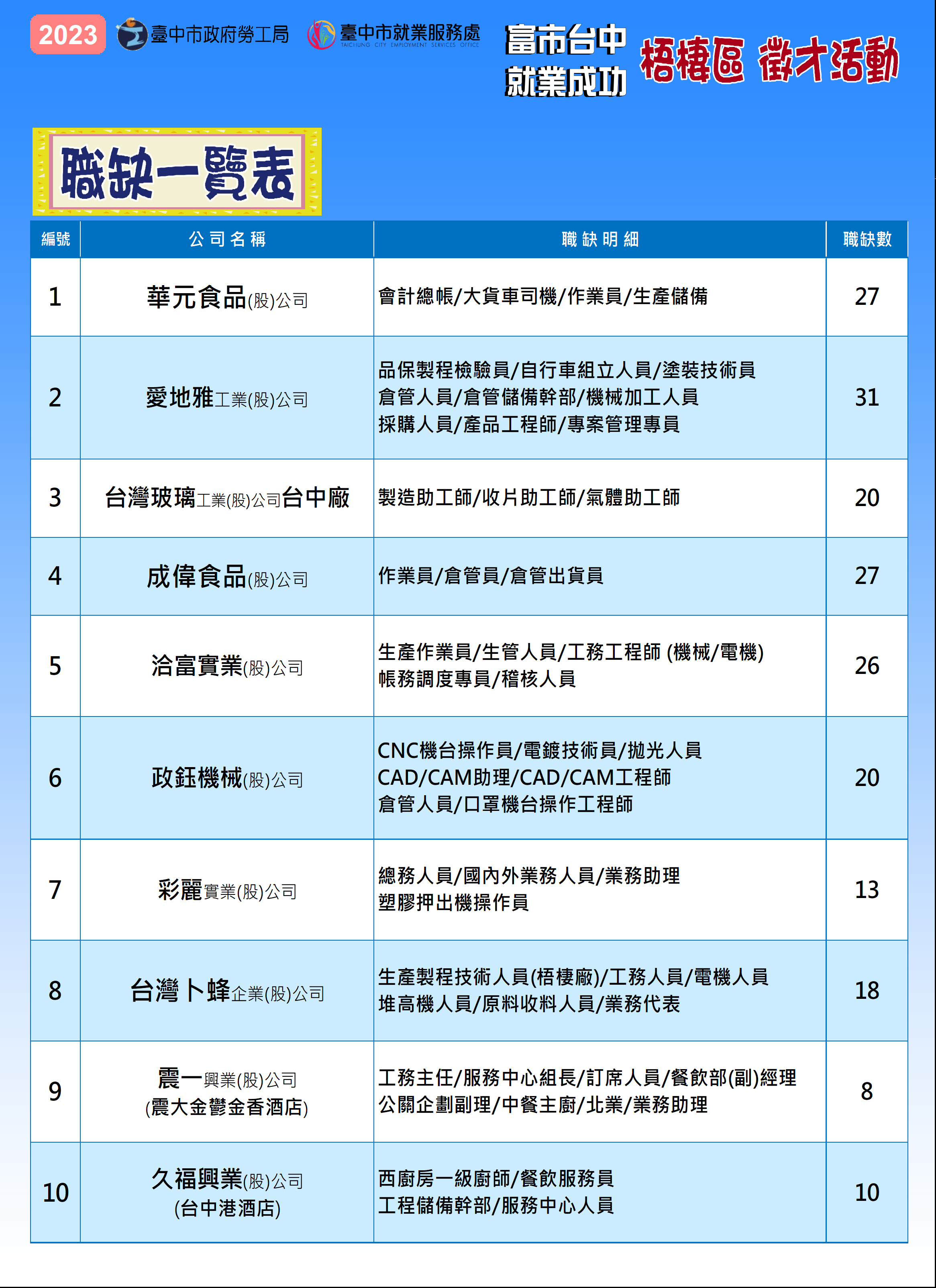 本場邀請華元、愛地雅、台玻、成偉、洽富、政鈺、彩麗、卜蜂、金鬱金香酒店及台中港酒店等10家廠商,提供會計總帳、採購人員、組立員、出貨員、司機、工程師、業務助理、業務員、企劃副理及服務人員等共計200個工作機會,歡迎有求職需求的市民朋友踴躍前往參加!