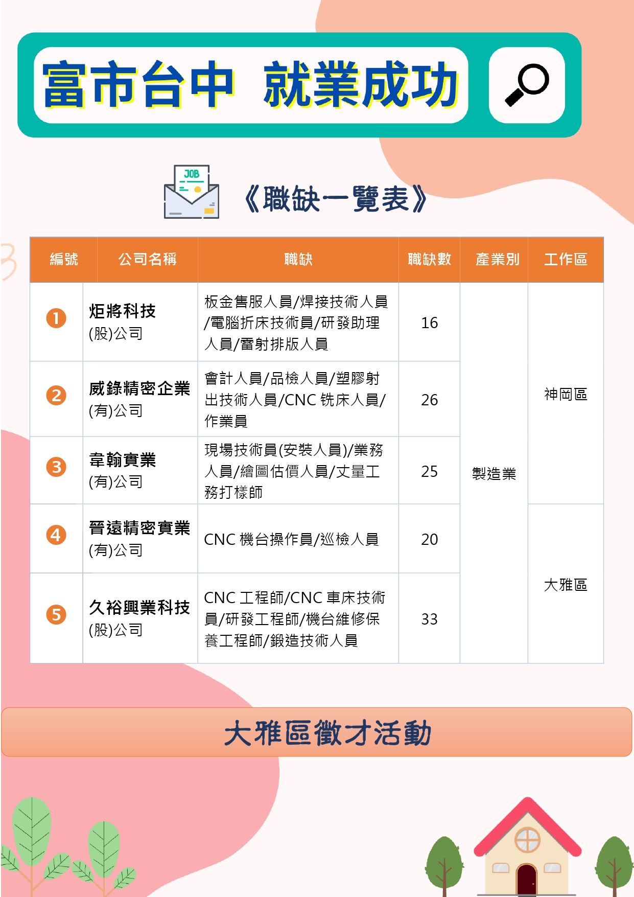本次活動邀請久裕興業、威錄精密及韋翰實業等5家廠商,提供120個職缺,歡迎踴躍參加。