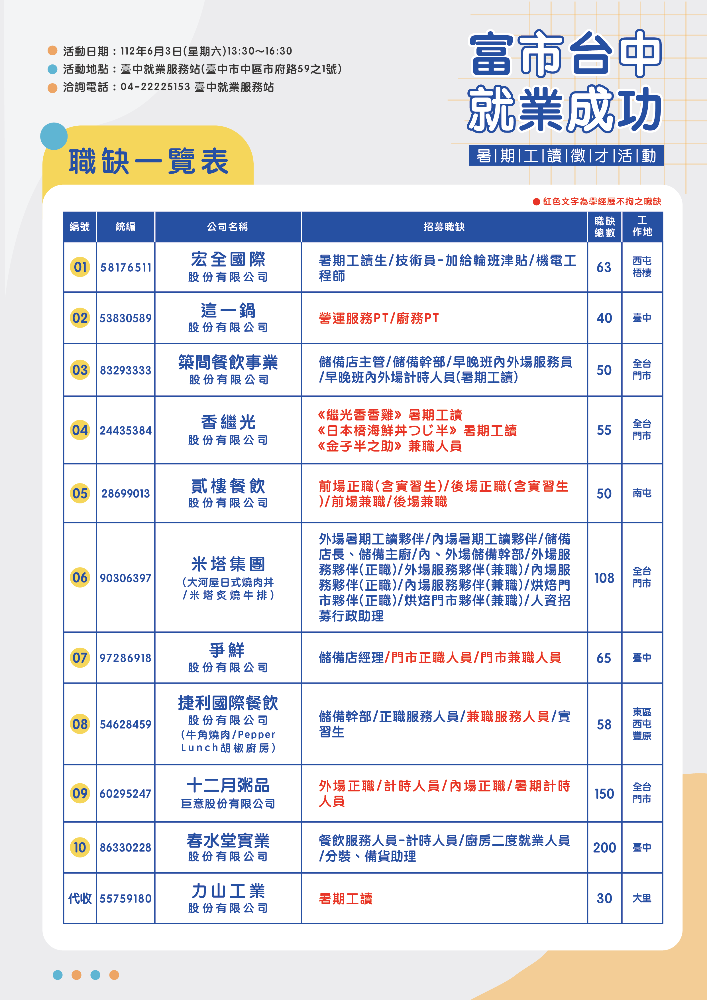 邀請宏全國際、這一鍋、米塔集團、爭鮮、春水堂等10家廠商,提供工程師、作業員、內/外場服務人員、餐飲服務員、儲備幹部等850個,正職、兼職、暑期工讀及實習生職缺,歡迎踴躍參加。