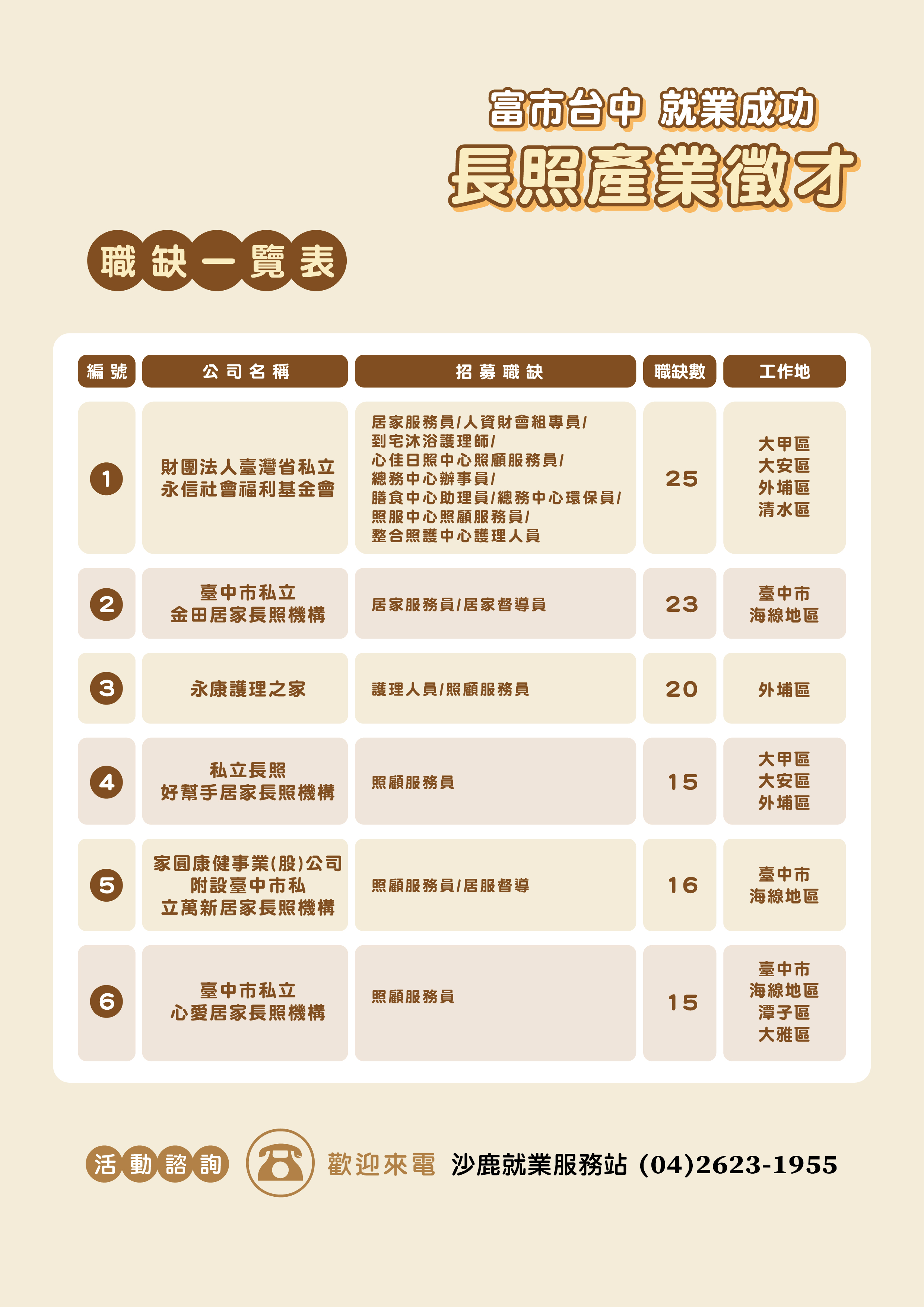 ??活動相關訊息請電洽:04-26231955 沙鹿就業服務站