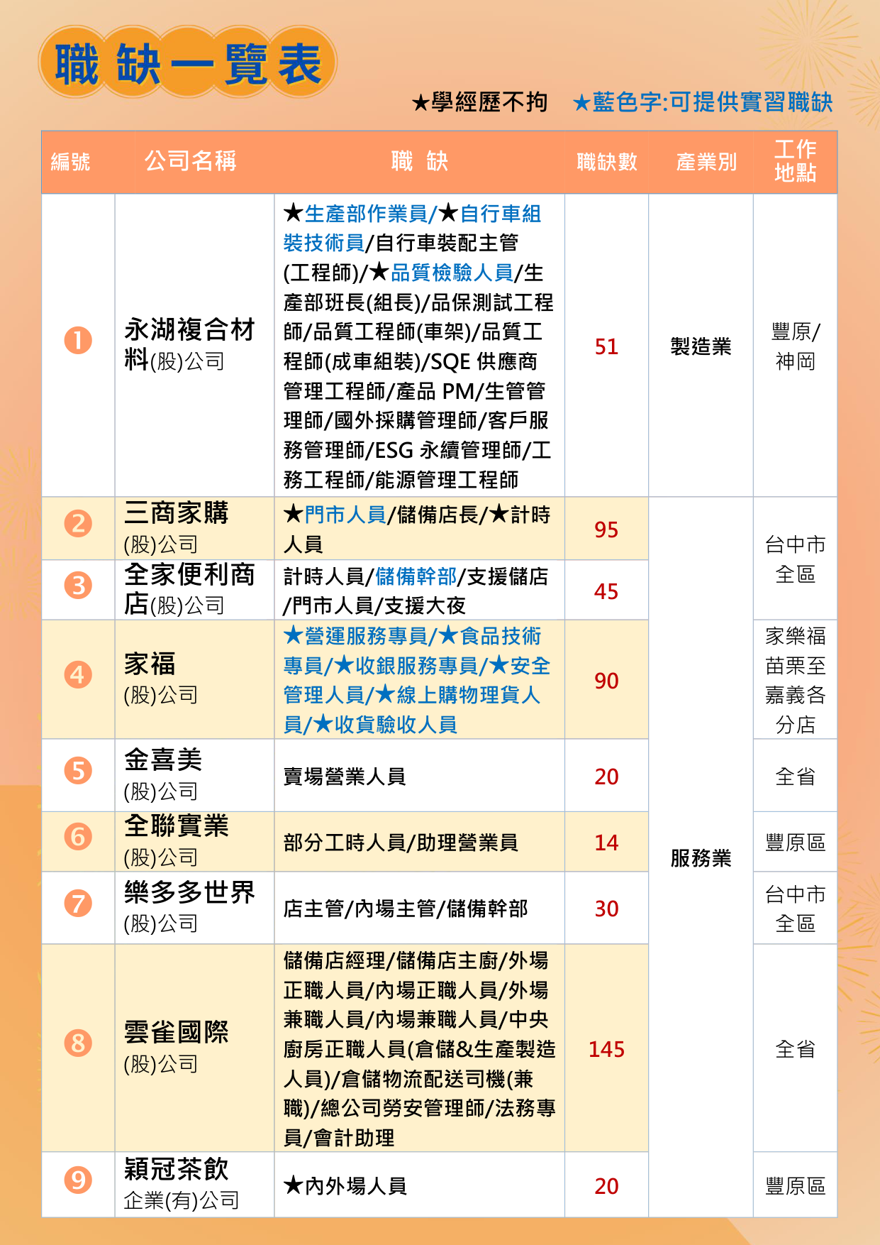 本次活動邀請雲雀國際、美廉社、家樂福及永湖複合材料等9家廠商,提供510個職缺,歡迎踴躍參加。