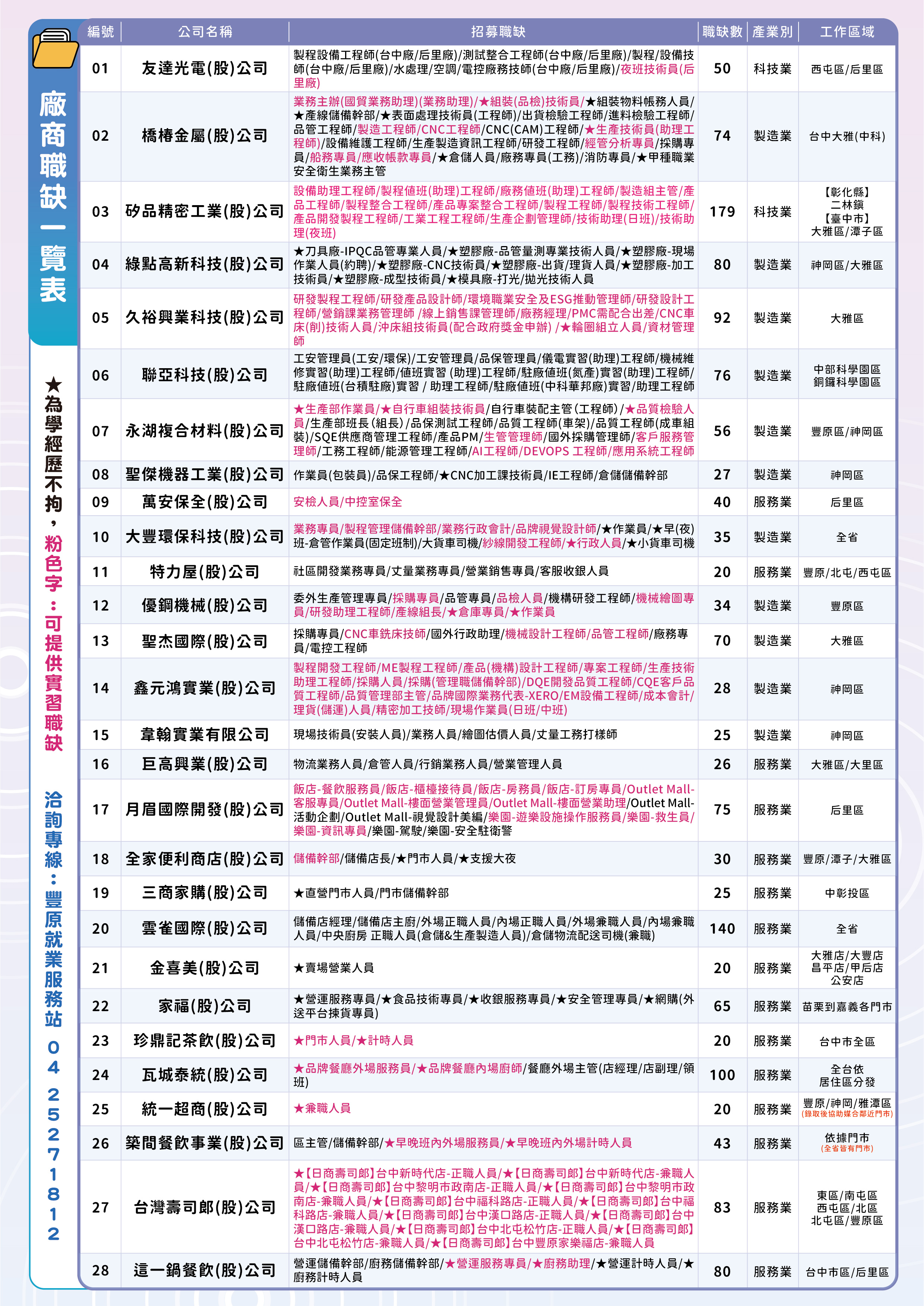 【欲了解活動詳情,歡迎至下列相關網站最新活動查詢】◆台灣就業通 https://www.taiwanjobs.gov.tw◆台中就業網 https://takejob.taichung.gov.tw◆臺中市就業服務處 https://www.eso.taichung.gov.tw◆一鍵Catch管理平台 https://1catchjob.taichung.gov.tw◆臺中市就業服務處《豐原就業服務站/各就業服務台》提供免費求職求才服務,歡迎有需求民眾就近洽詢。