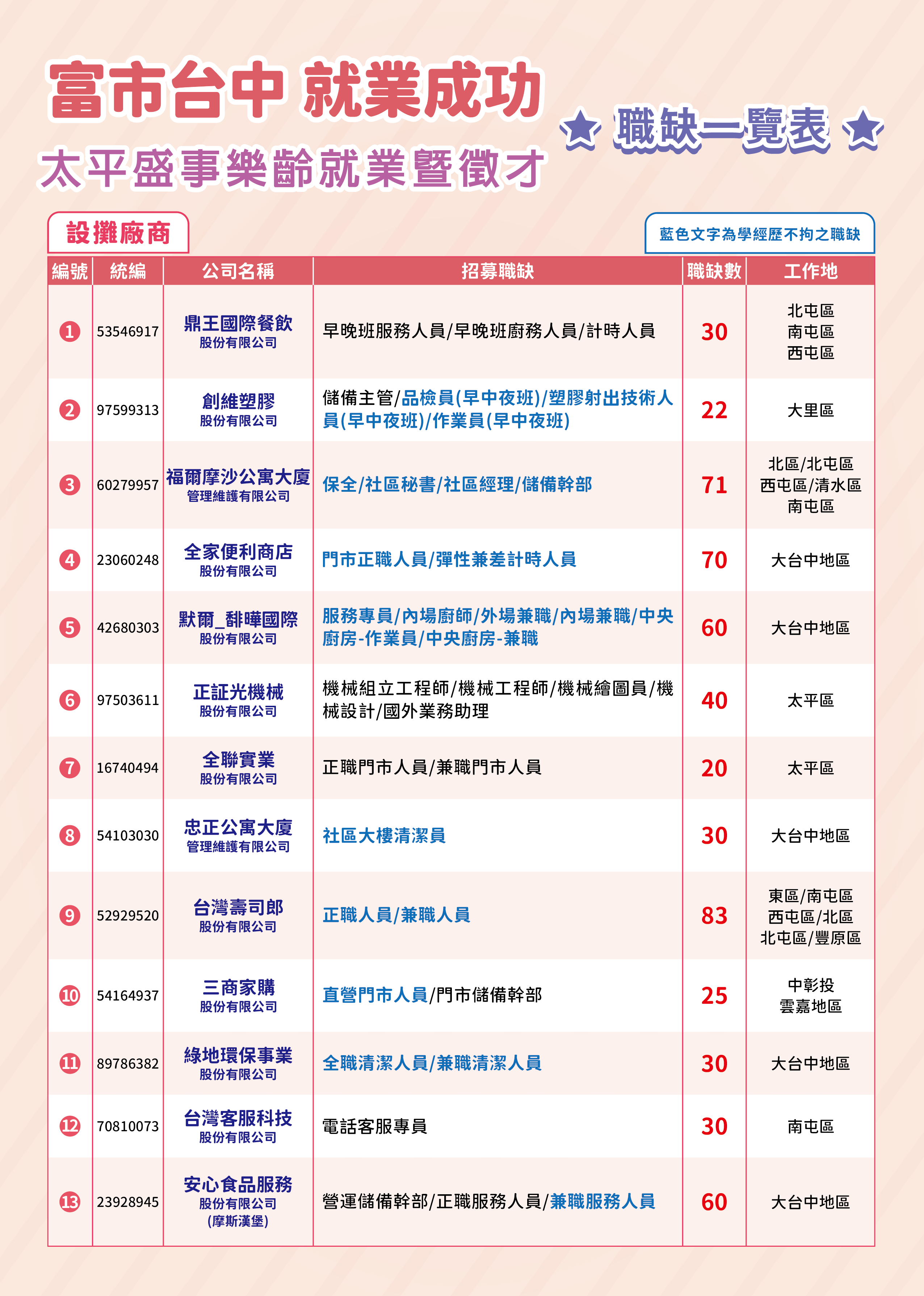 ▲邀請鼎王國際、創維塑膠、摩斯漢堡及全聯等13家廠商,提供逾570個多元職缺,歡迎求職民眾踴躍參加。