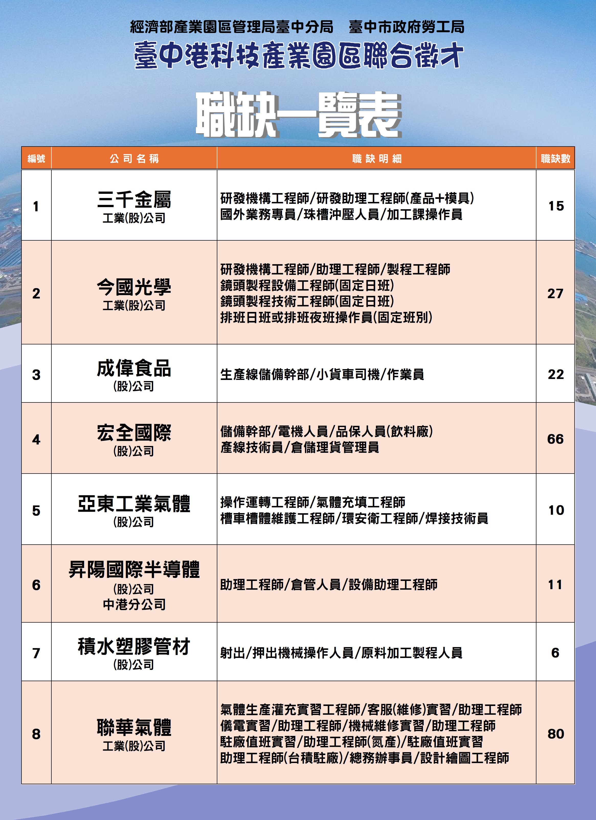 本場邀請三千金屬、今國光學、成偉食品、宏全國際、亞東氣體、昇陽半導體、積水塑膠及聯華氣體等8家廠商,共計237個工作機會,歡迎市民朋友踴躍前往參加!
