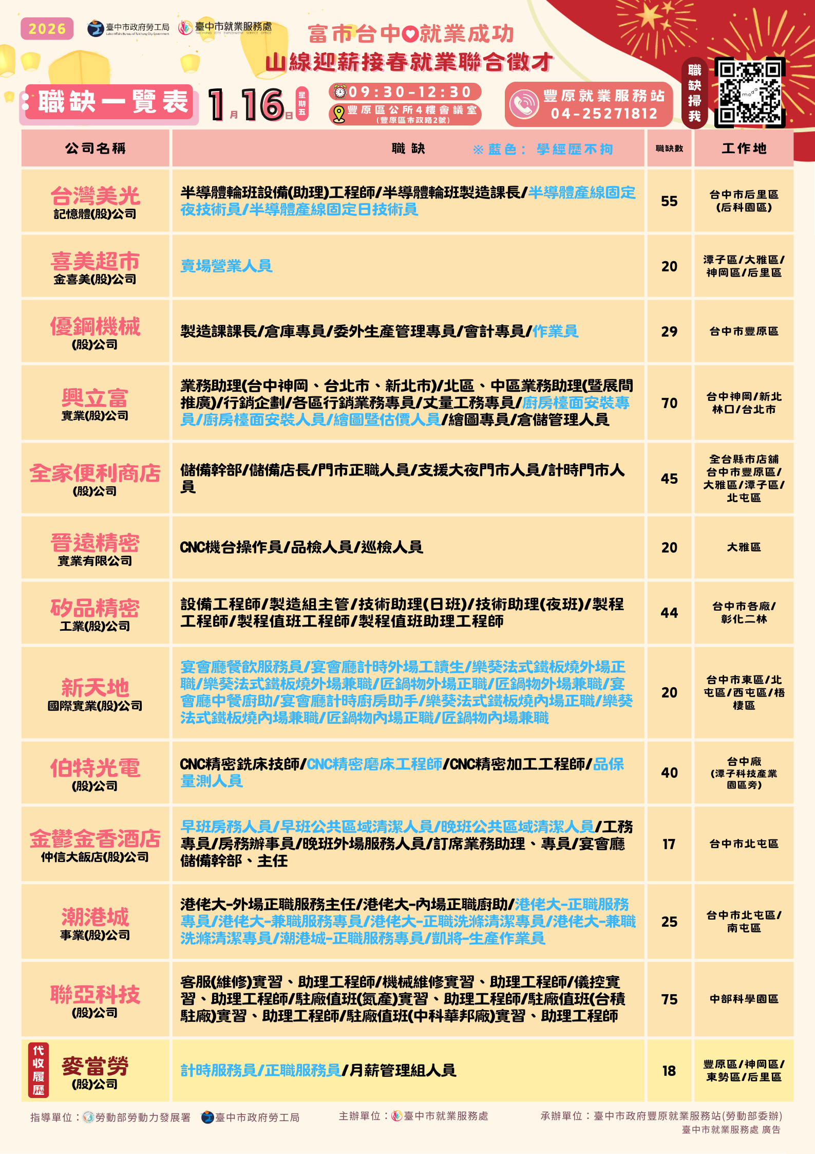 邀請台灣美光、聯亞科技、全家便利商店及新天地等共13家廠商, 提供超過450個工作機會,歡迎市民朋友踴躍參加。