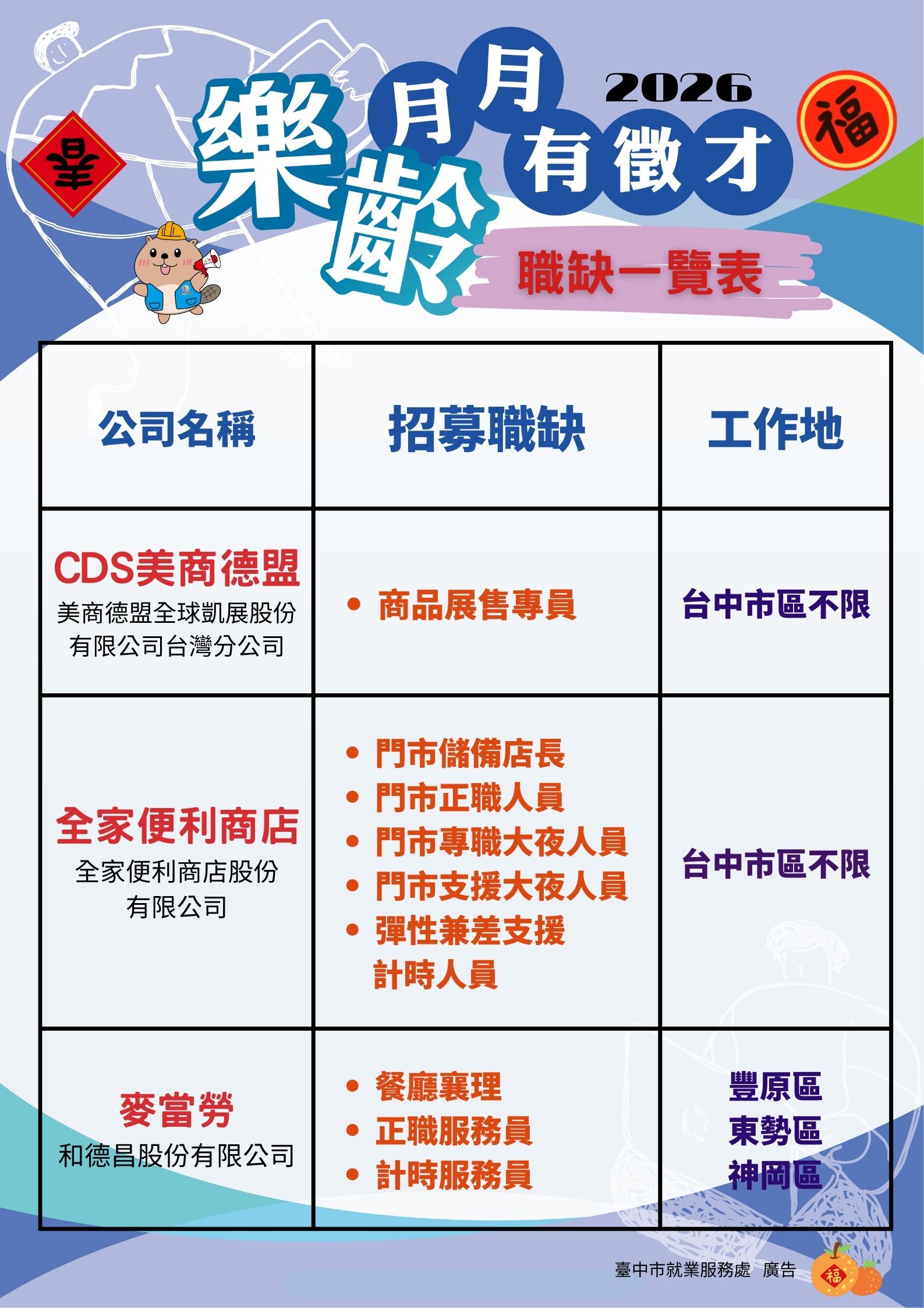 2026「富市台中 就業成功」樂齡就業月月有徵才